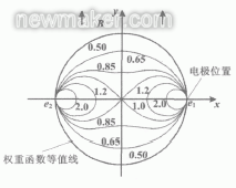 在生產過程中,最難處理的是另外一種波動。該波動周期很慢,但幅度很大,大到足以引起跳車。要把這種現象解釋清楚,就需要引進權重函數的概念[3-6]。粗略地說,權重函數給出了不同位置的流體切割磁力線所產生的感應電動勢對電極信號的貢獻率。權重函數示意圖如圖2所示。