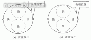 由圖3(a)可知,權重函數高的地方流速快,而權重函數低的地方流速慢,這時轉換器流量輸出增大;由圖3(b)可知,權重函數低的地方流速快,而權重高的地方流速慢,甚至電極被覆蓋,這時轉換器輸出減小,甚至接近于零。