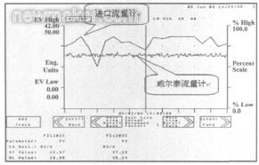 本文所提的解決方案先后成功應用于國內兩家煤化工企業。首先,該方案被應用于波動相對頻繁的豎管,橫管仍然采用原來的進口流量計。某企業因原進口流量計波動頻繁而引發跳車事故一年多達幾十次。由于威爾泰所提供的煤漿流量計平穩性遠優于其他同類產品,自投運以來,該企業從未因流量計波動而引起誤跳車。圖5所示為監控系統工作站屏幕截圖所得的流量輸出平穩性對比圖。由圖5可以看出,當位于橫管的進口流量計出現大幅度波動時,豎管威爾泰流量計輸出仍然保持平穩。同時,工藝人員利用爐溫等其他參數進行綜合判斷,同樣證明了該豎管流量計輸出的穩定性。